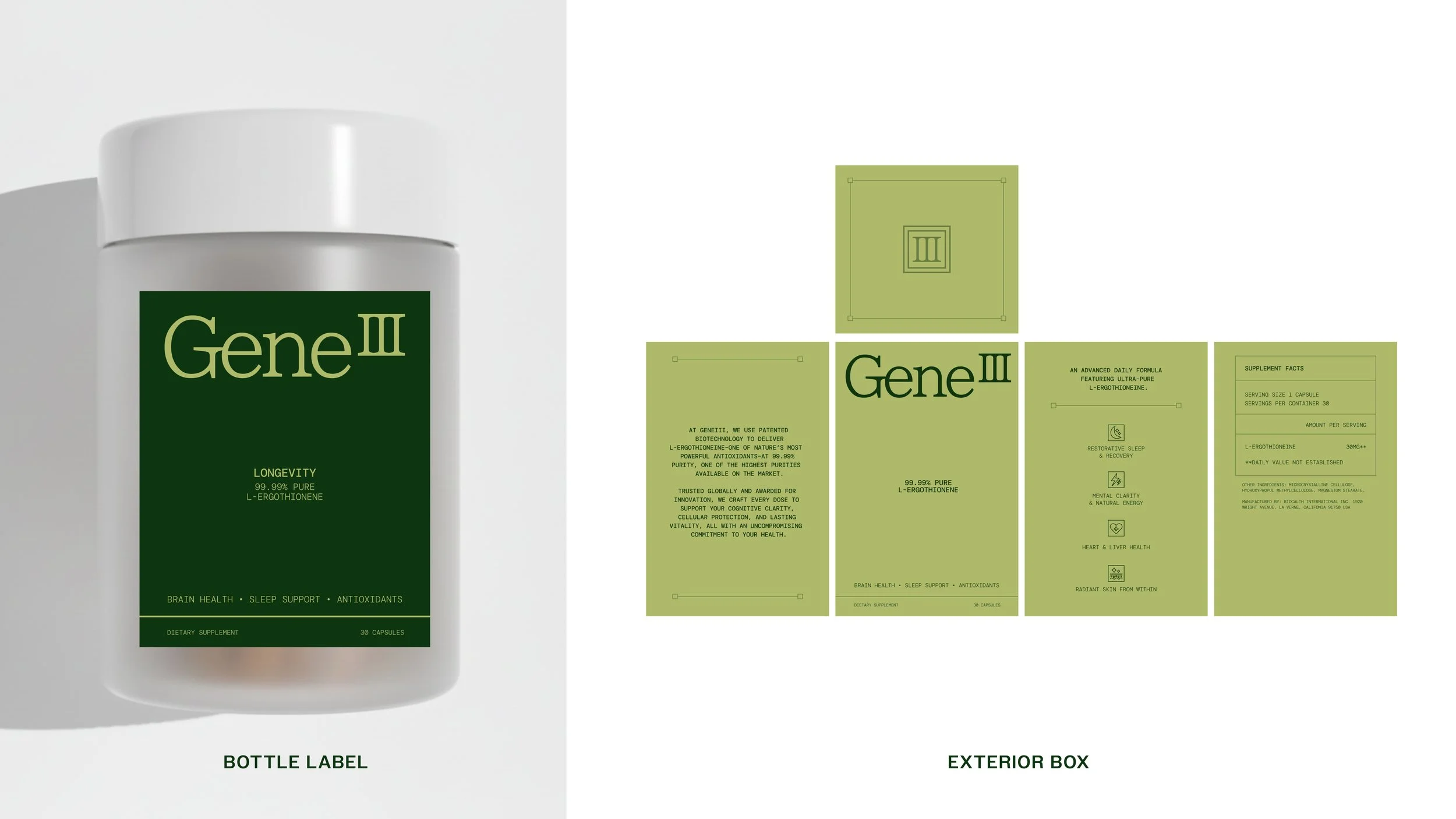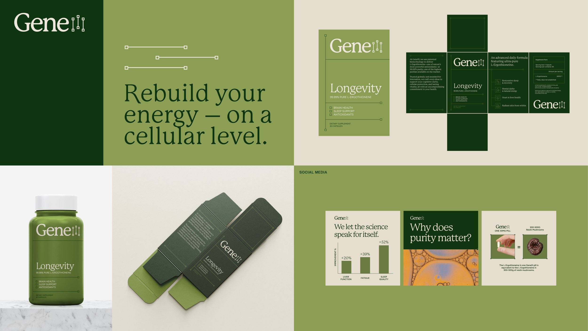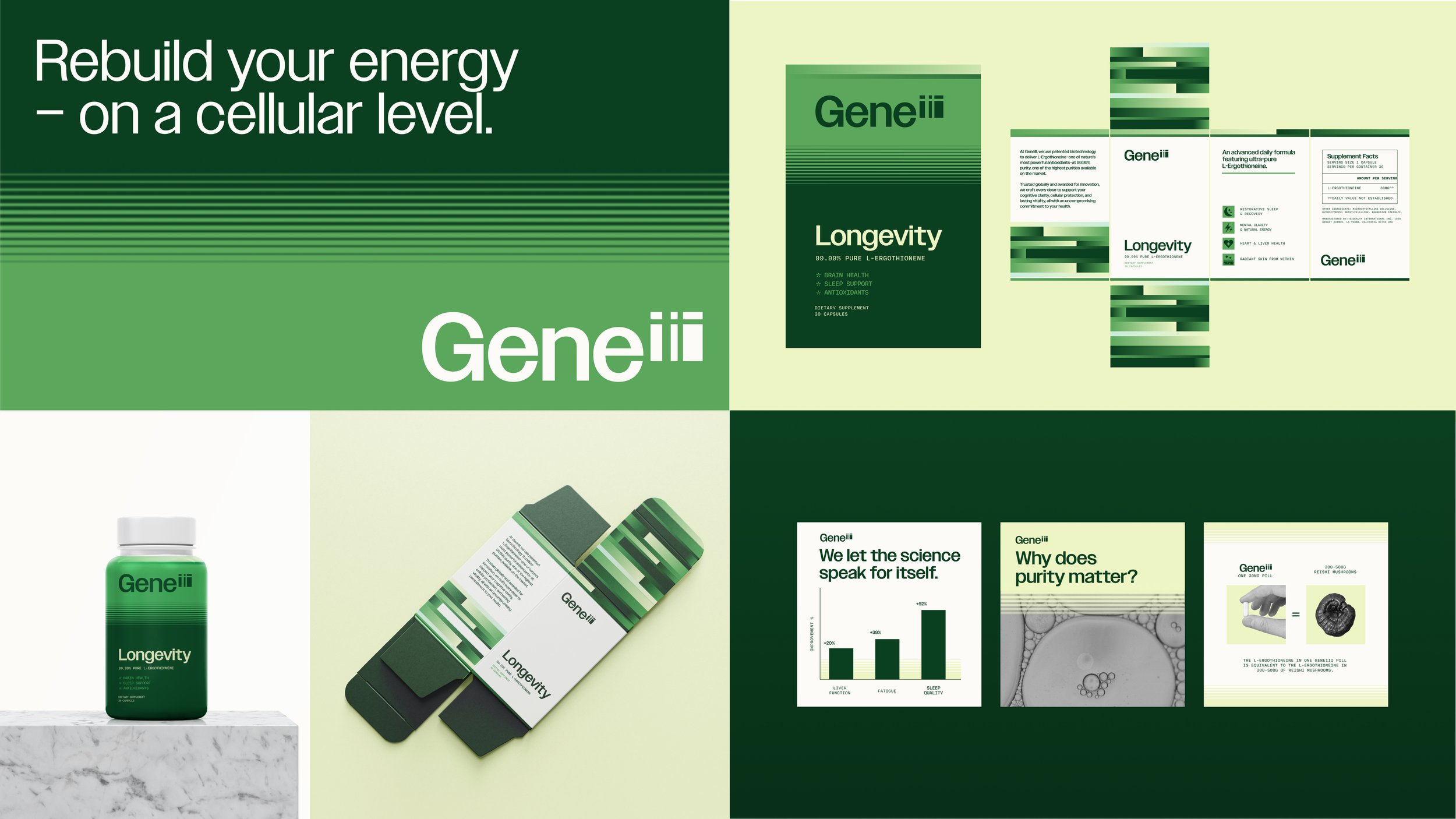 GeneIII is a supplement brand rooted in science that provides 99.99% Pure L-Ergothionene tablets to support your brain, sleep, and cell health. Wanted to expand their business in the US, they wanted a brand refresh that felt premium and targeted an older female audience.